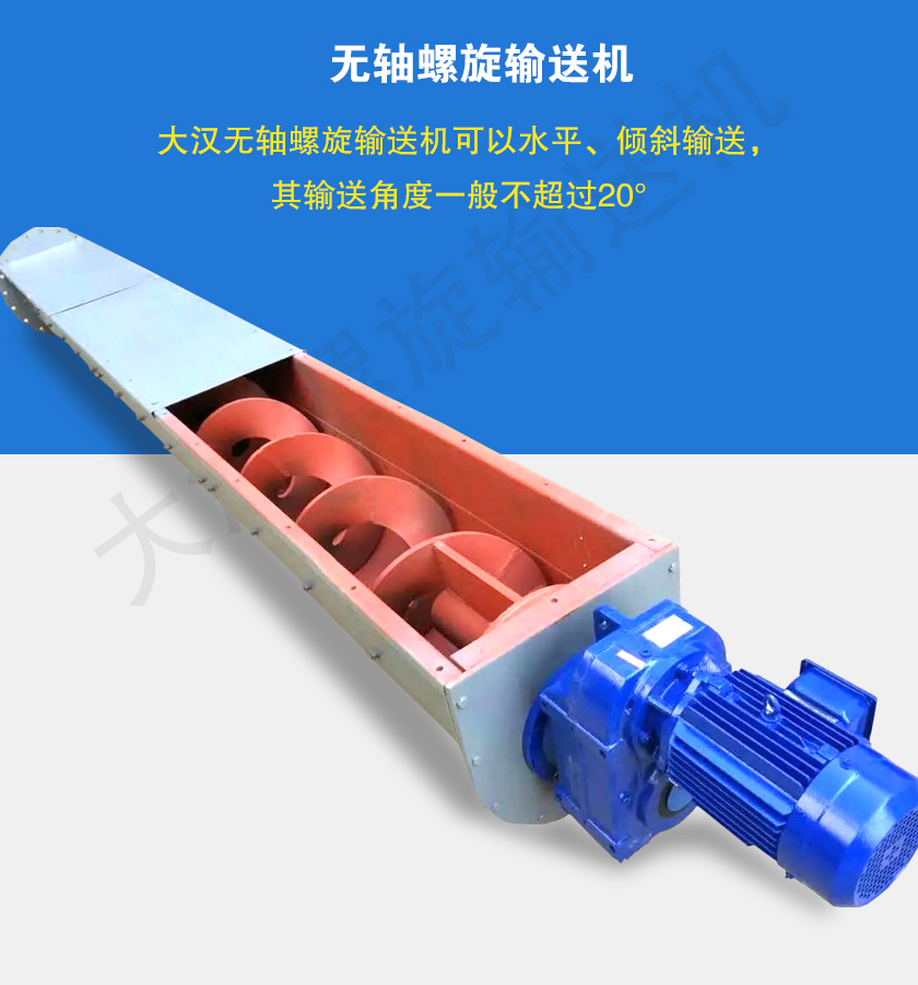 無軸螺旋輸送機采用無中心軸設計,可輸送傳統有軸螺旋輸送機和皮帶輸送機不能或不易輸送的物料,如顆粒狀和粉狀物料、濕的和糊狀物料、半流體和粘性物料、易纏繞和易堵塞物料、有特殊衛生要求的物料。